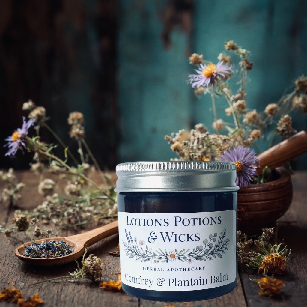 Comfrey (aka knitbone - used to help bones knit together) and Plantain are two remarkable herbs known for their healing properties, and together they provide numerous benefits for skin health. Comfrey is rich in allantoin, a compound that promotes cell regeneration, while Plantain offers natural antimicrobial properties, helping to prevent infections in minor wounds and skin abrasions..